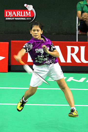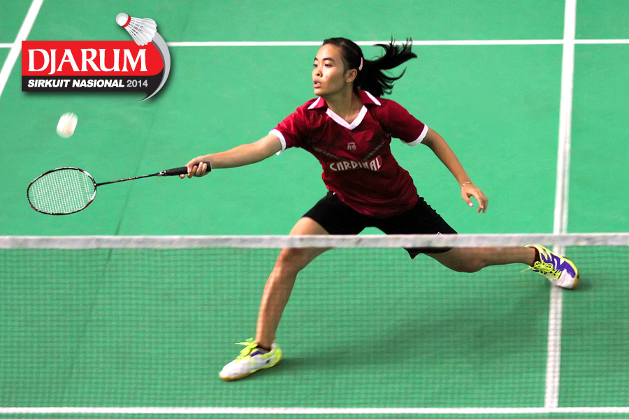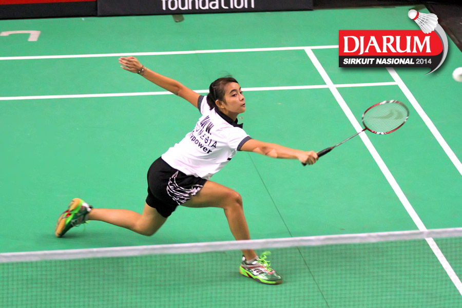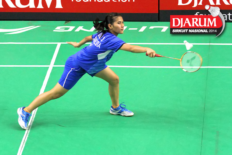 Silvi Wulandari (PB Djarum) mengembalikan shuttlecock ke arah Ersa Narulia (Jaya Raya Az-Zikra)