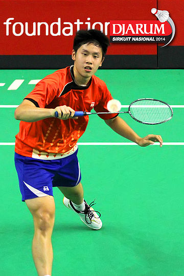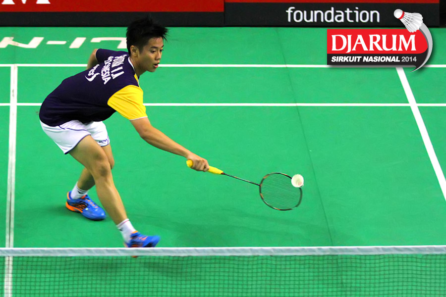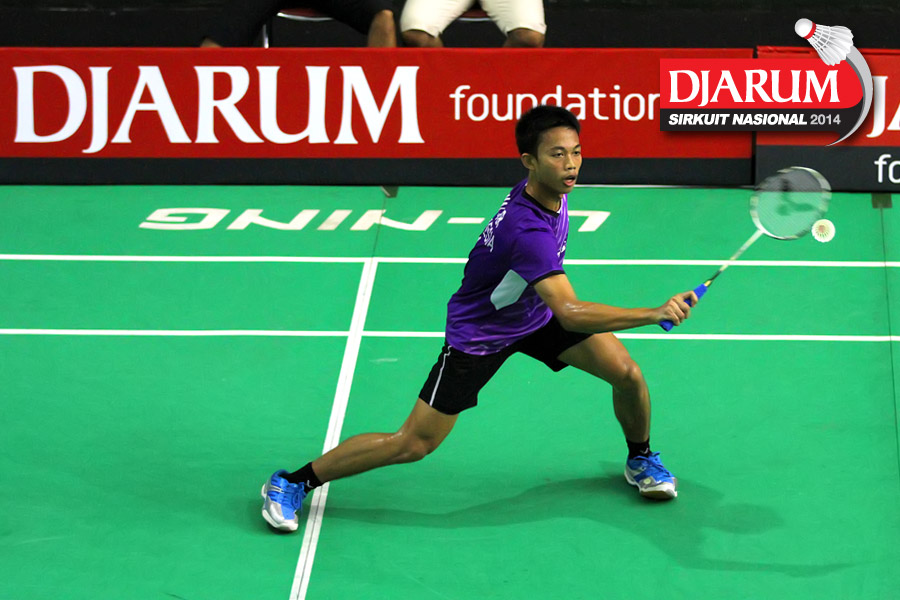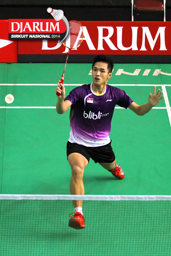 Jonatan Christie (Pelatnas) bersiap menyambar pengembalian tanggung dari Alvindo Saputra (Tangkas)