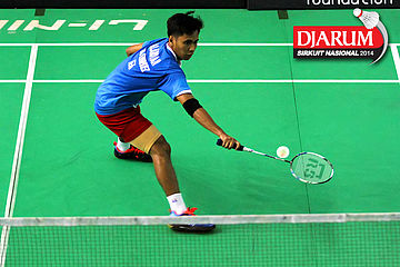 Alamsyah Yunus (JR Enkei) mengembalikan shuttlecock ke arah Rifan Fauzin (Pelatnas).