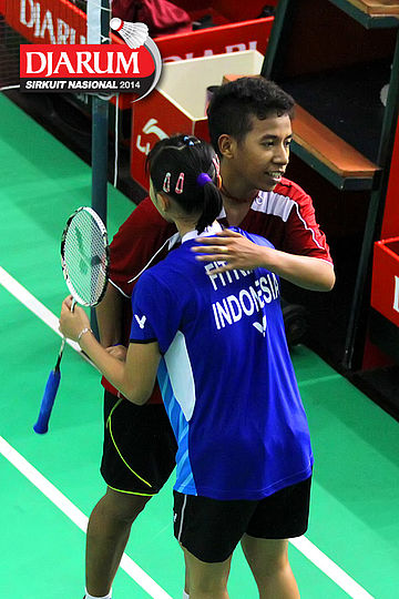 Elizabeth Purwaningtyas (SGS PLN) dan Fitriani (Pelatnas) saling berpelukan usai bertanding