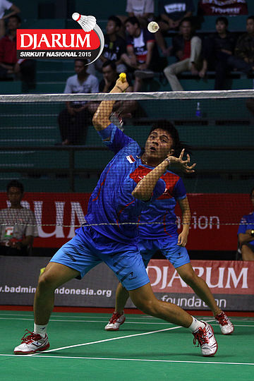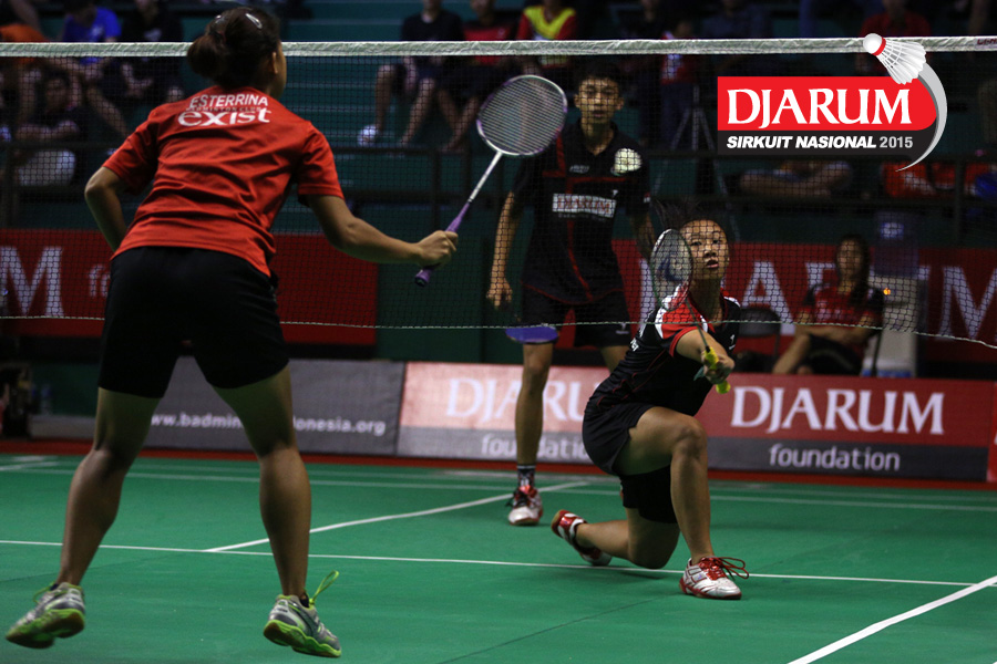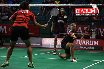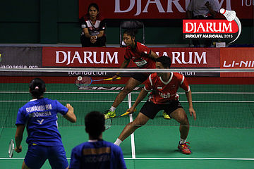 Moehamat Febriansyah/Rofahadah SUpriadi (Djarum Kudus) menghadang serangan.