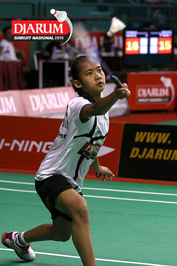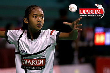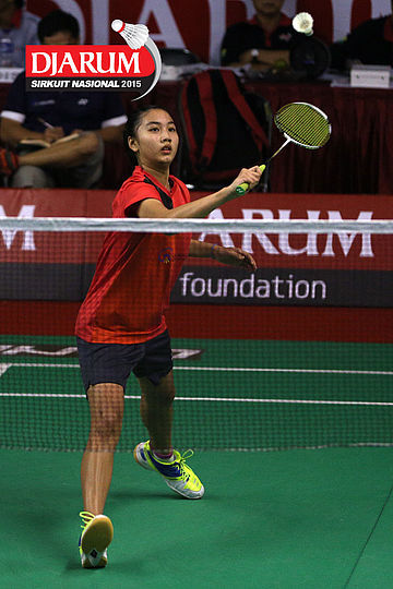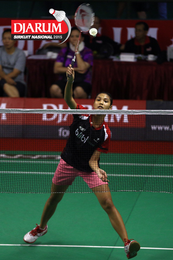 Desima Aqmar (Djarum Kudus) mengembalikan shuttlecock.