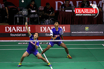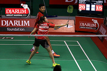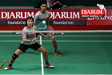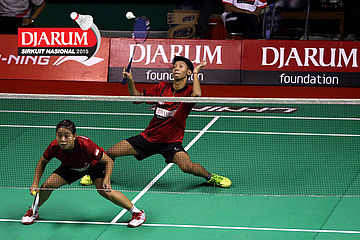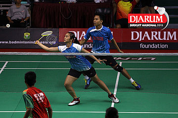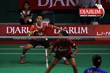 Moehamat Febriansyah/Rofahadah SUpriadi (Djarum Kudus) bersiap menghadang serangan.