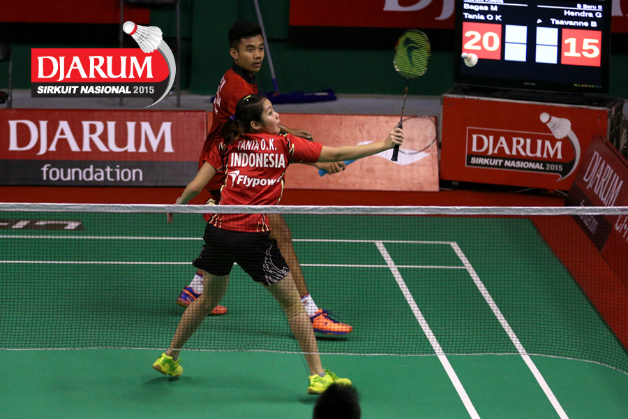 Bagas Maulana/Tania Oktaviani (Djarum Kudus) mengembalikan shuttlecock.