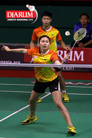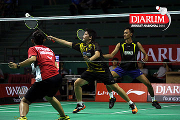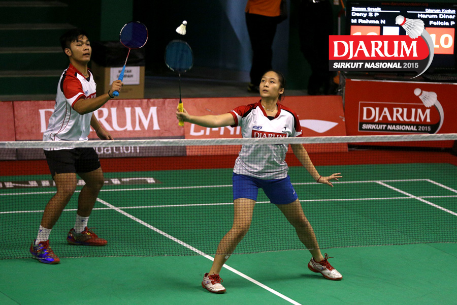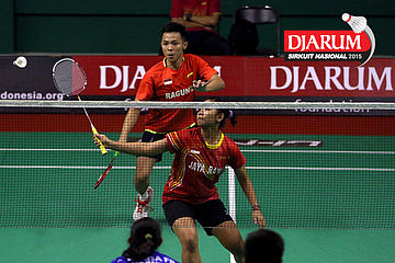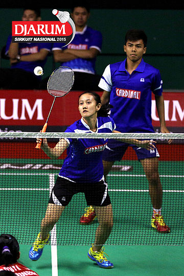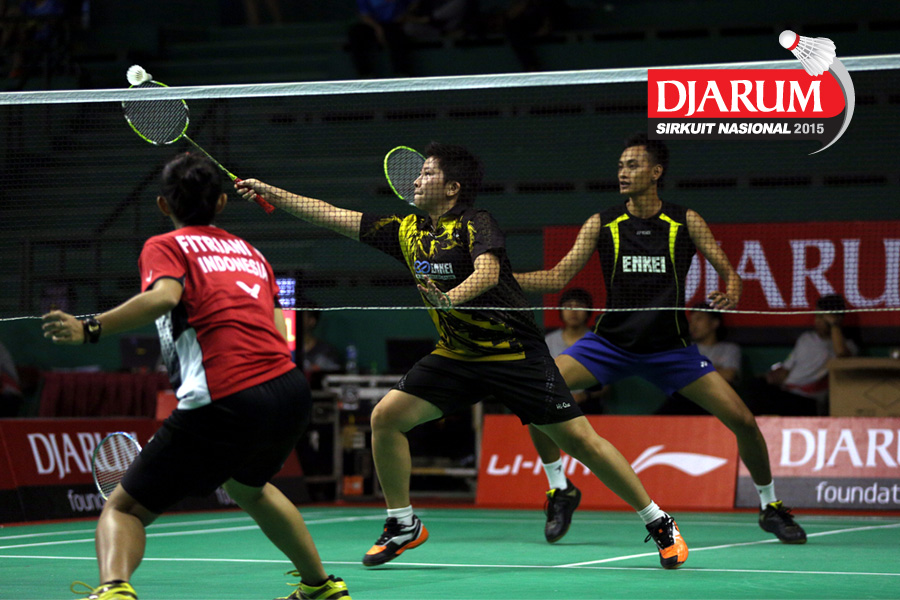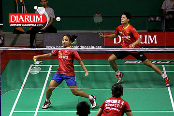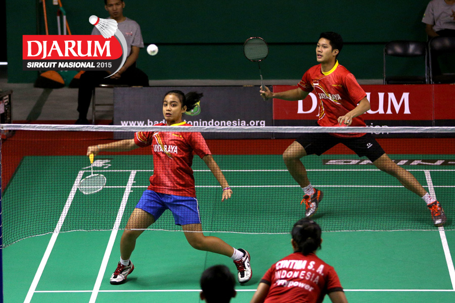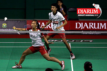 Nugroho Andi/Natalia Poluakan (JR Enkei) mengembalikan shuttlecock.
