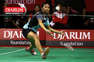 Alya Rahma (Djarum Kudus) bersiap menggapai shuttlecock.