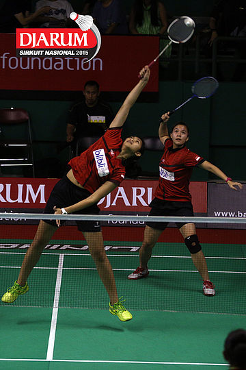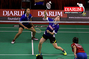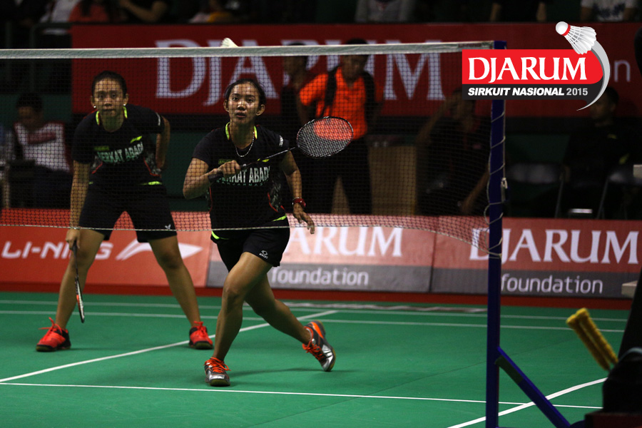 Cynthia Shara/Rofahadah Supriadi (Djarum Kudus) bersiap menyambar pengembalian.