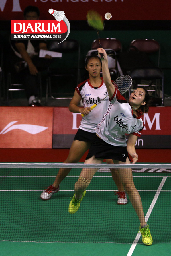 Tania Oktaviani/Vania Arianti (Djarum Kudus) melepaskan serangan.