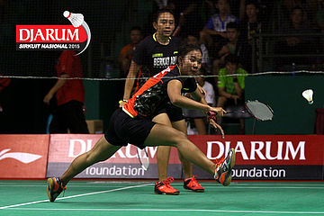 Dian Fitriani/Nadya Melati (Pertamina Fastron) mengembalikan shuttlecock.