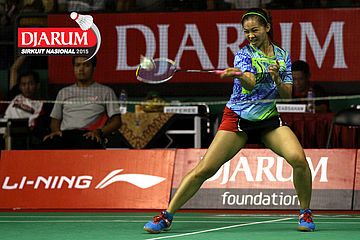 Febby Angguni (Tjakrindo Masters) mengembalikan shuttlecock.
