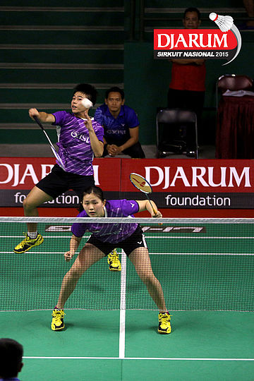 Kevin Ezra/Angelica Wiratama (Exist) mengembalikan shuttlecock.