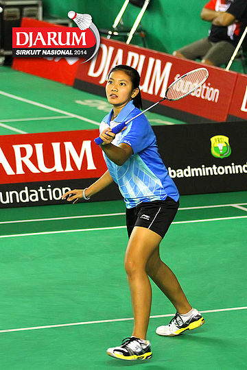 Trifena Selaindoong (PPLP Sulut) mengembalikan shuttlecock ke arah Karen Darmawan (PB Djarum)