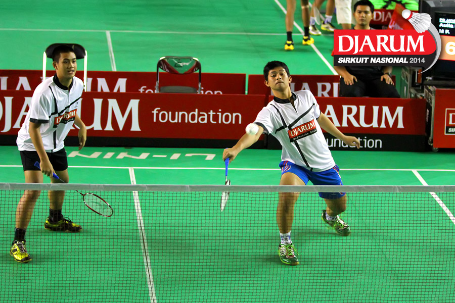 Helmi Abbu/M. Daffa (PB Djarum) berhasil menghadang serangan yang dilepaskan Aulia Rahman/M. Febriansyah (Jaya Raya)