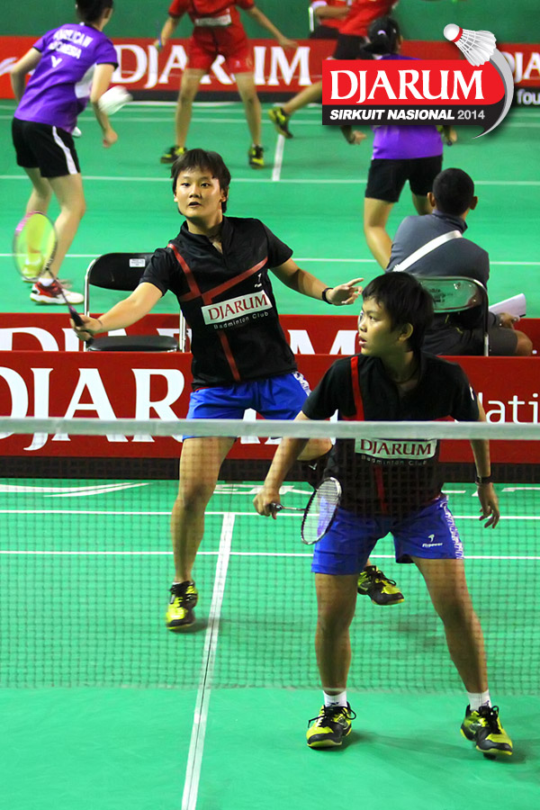 Agatha Imanuele/Siti Fadia (PB Djarum) mengembalikan shuttlecock ke arah Delita Mamesah/Mergie Tairas (PPLP Sulut)