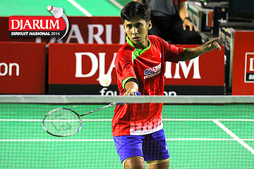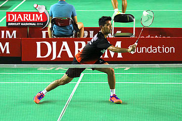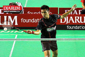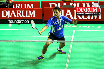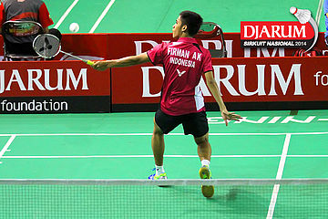 M. Zulkifli (PB Djarum) berusaha menggapai pengembalian dari Haniffan Yuslap (Mutiara Bandung)