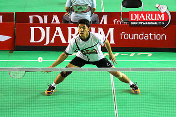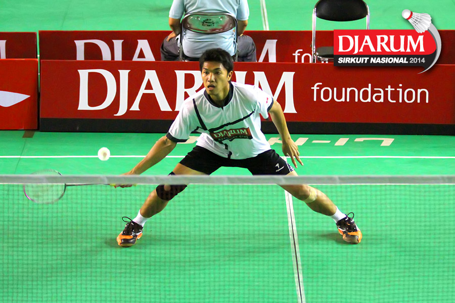 Kho Hendrikho (PB Djarum) bersiap menyambut pengembalian dari Yoga Sidik (Pelatprov PBSI DKI Jakarta)