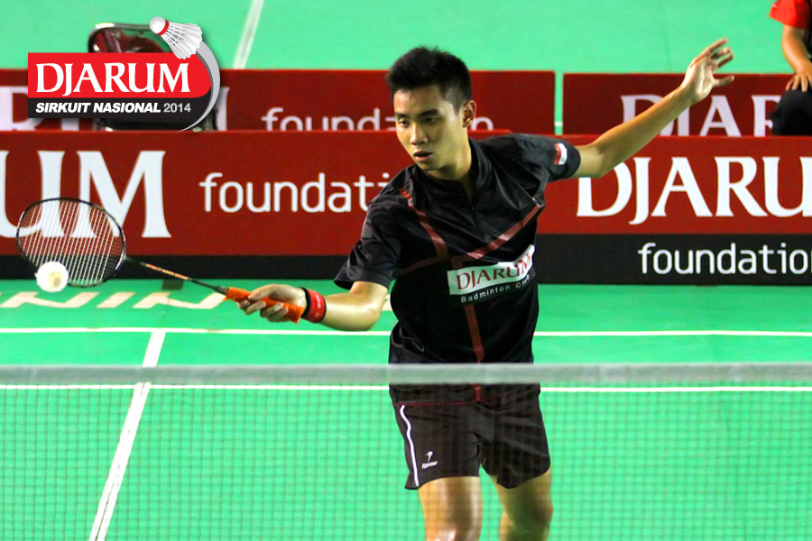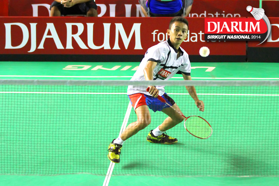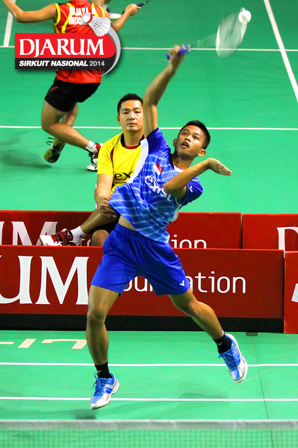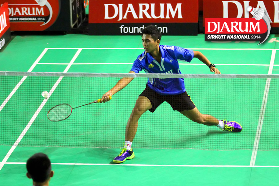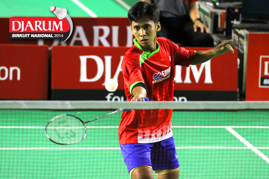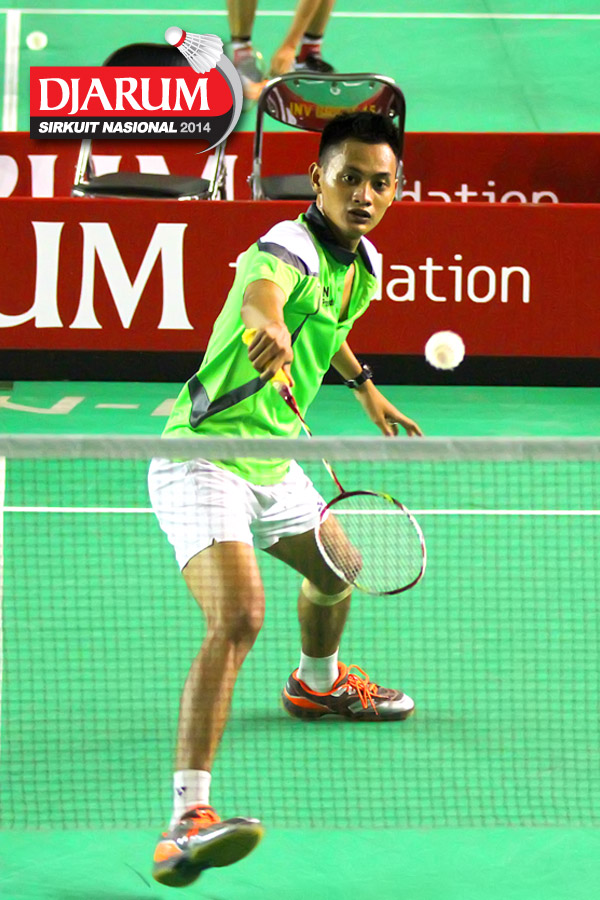 Alamsyah Yunus (JR Enkei) mengembalikan shuttlecock ke arah Christofle Brians (Pelatprov PBSI DKI Jakarta)