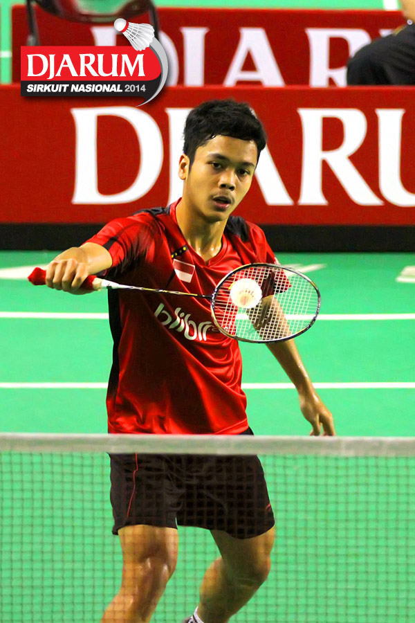 Anthony Sinisuka Ginting (Pelatnas) mengembalikan shuttlecock ke arah Rendy Ismanto (SGS PLN)