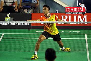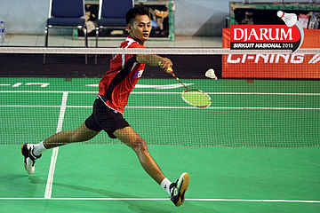 Redy Perdana (Pelatnas) bersiap menyambut pengembalian dari Nugroho Andi (JR Enkei).