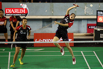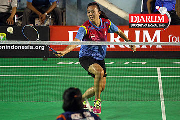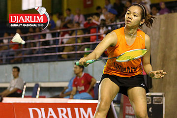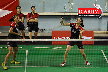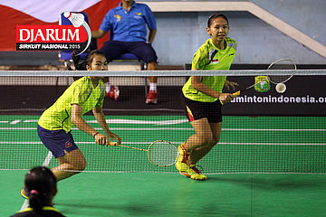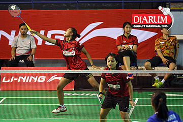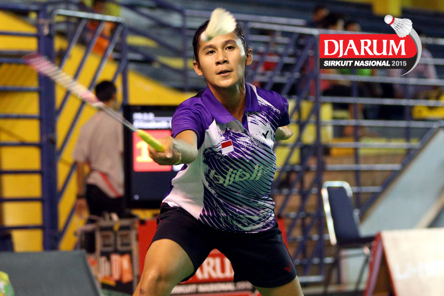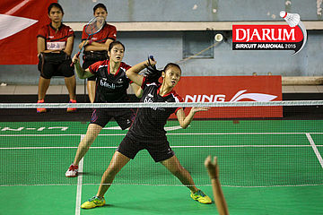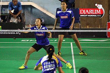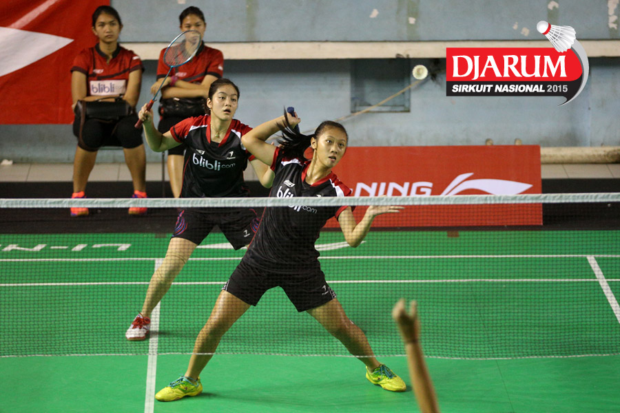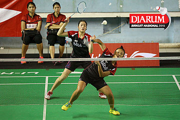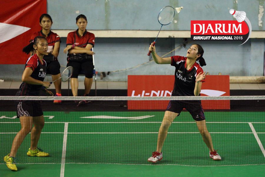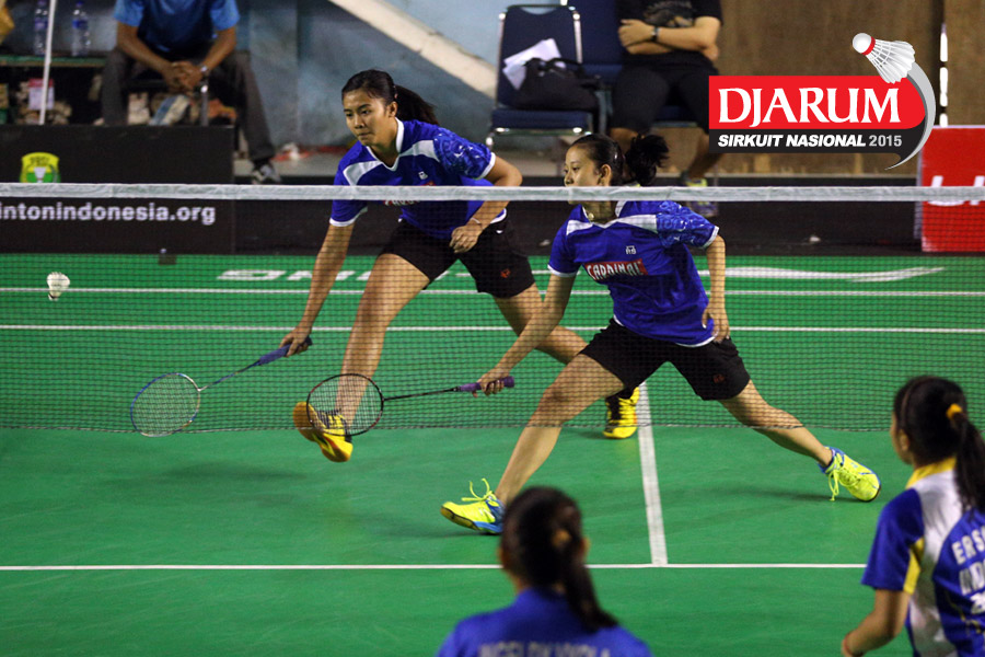 Cynthia Shara/Rofahadah SUpriadi (Djarum Kudus) mengembalikan shuttlecock ke arah Ashyarti Dwi/Esterina Agus (Exist).