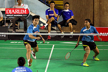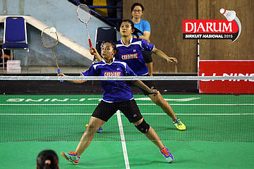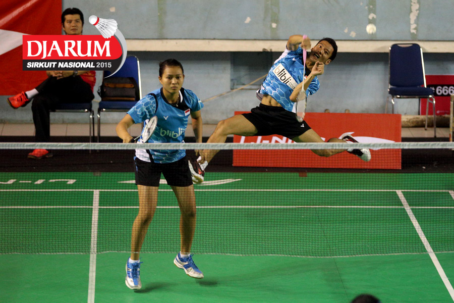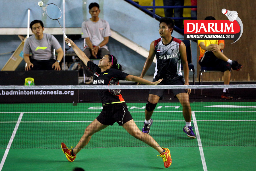 Lukhi Apri/Zakia Ulfa (Pelatnas) melepaskan serangan ke arah Erwin Rendana/Dewi Setya (Bayu Kencana).