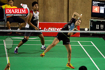 Jeka Wiratama/Vita Marisa (Djarum Kudus) berusaha menggapai pengembalian dari Aryanto Haryadi/Nathalia Poluakan (JE Enkei).