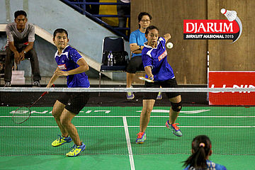 Mychelle Crhystine/Serena Kani (Djarum Kudus) menyambut pengembalian dari Aliana Kurniawati/Istrati Putri (Candra Wijaya/JR Enkei).