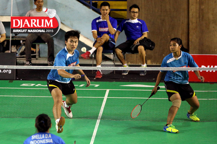 Dianita Saraswati/Yulfira Barkah (Mutiara Cardinal) mengembalikan shuttlecock ke arah Brigita Marcelia/Vehrenica Debora (Exist/Tangkas).