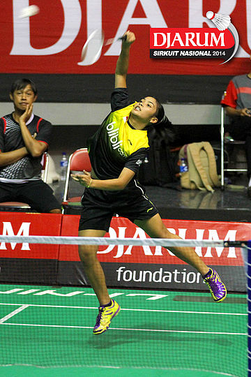 Ana Rovita (PB Djarum) berusaha menggapai pengembalian dari Febtria Adisthya (Mutiara Bandung).