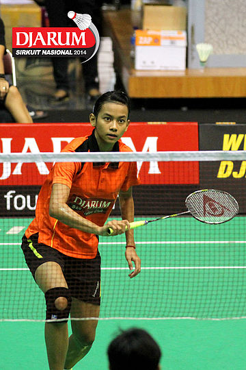Ganis Nurrahamndani (Pertamina Fastron) gagal mengembalikan shuttlecock ke arah Dinar Dyah Ayustine (PB Djarum).