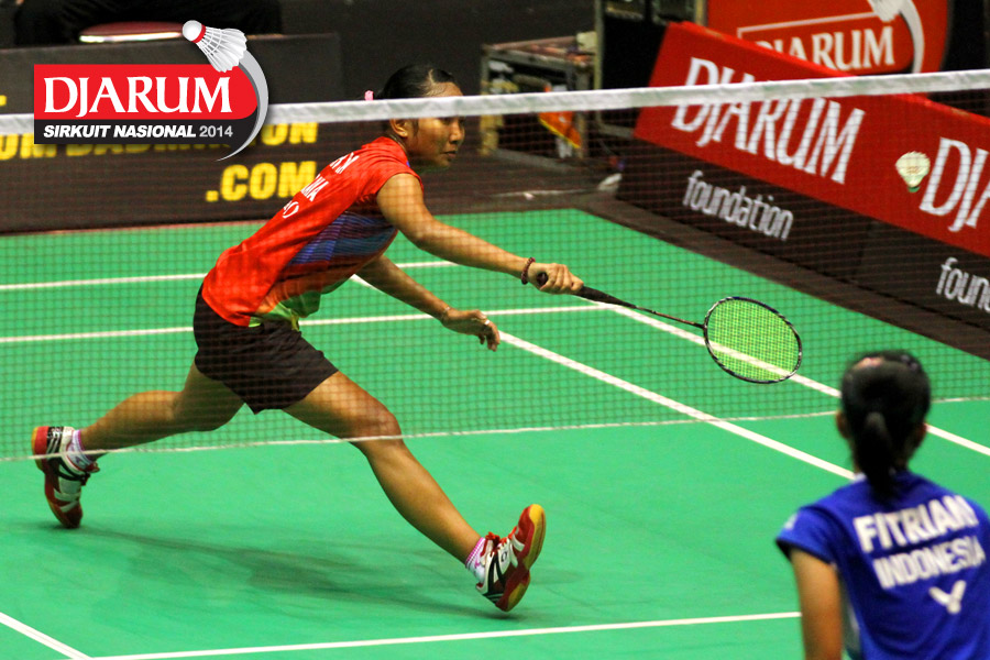 Fitriani (Pelatnas) berhasil mengembalikan shuttlecock ke arah Mega Cahya (Jaya Raya).