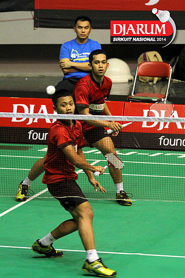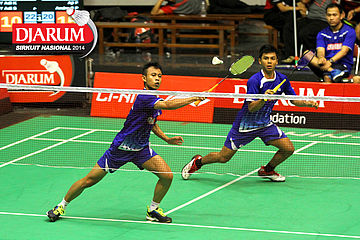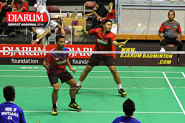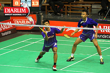 Aji Firmansyah/Andre Suryo (Mutiara Bandung) menyambut pengembalian dari Yahya Adi/Yantoni Edi (PB Djarum).