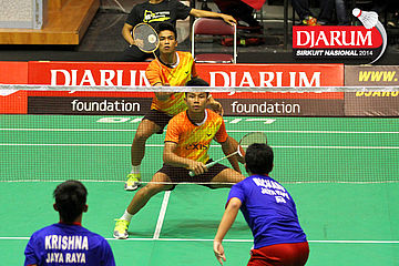 Krishna Adi/Richard Kuncoro (Jaya Raya Suryanaga) bersiap menghadang serangan dari Gea Kamahamas/Giovani Dicky (Exist).