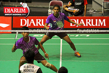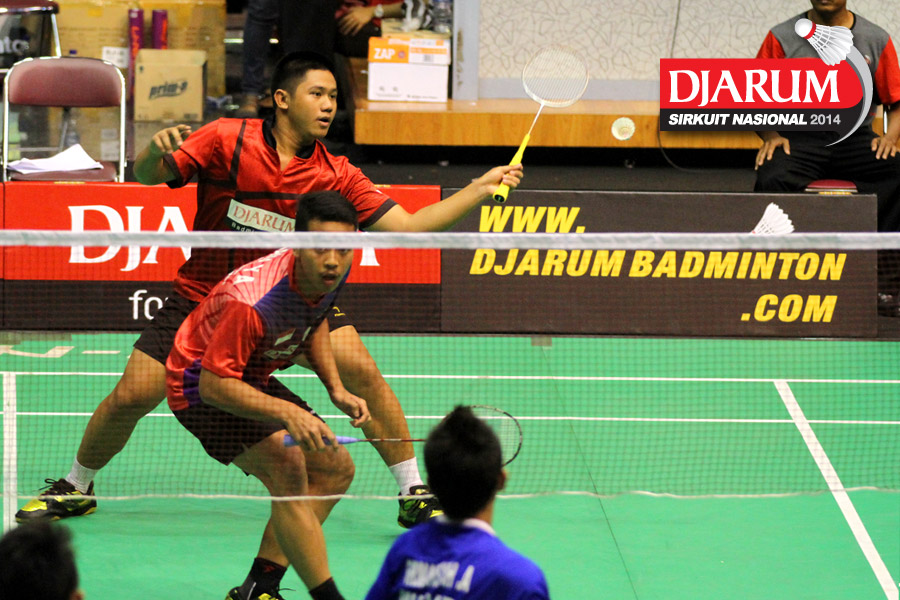 Akbar Bintang/Jeka Wiratama (PB Djarum) menyambar serve dari Endrue Tampi/Zachariah Josiahno (Tangkas).