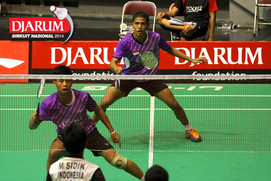 Krishna Adi/Richard Kuncoro (Jaya Raya Suryanaga) mengembalikan shuttlecock ke arah Gea Kamahamas/Giovani Dicky (Exist).