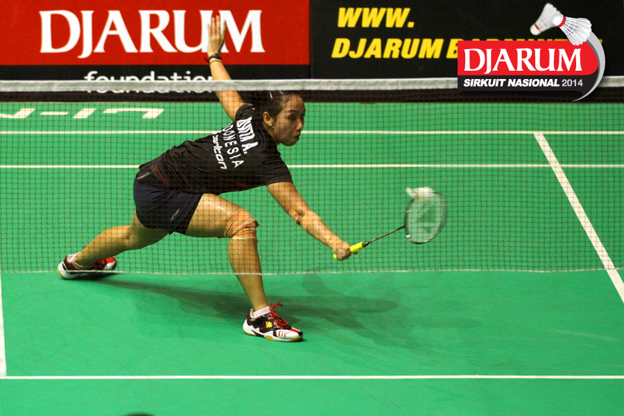Ana Rovita (PB Djarum) mengembalikan shuttlecock ke arah Febtria Adisthya (Mutiara Bandung).