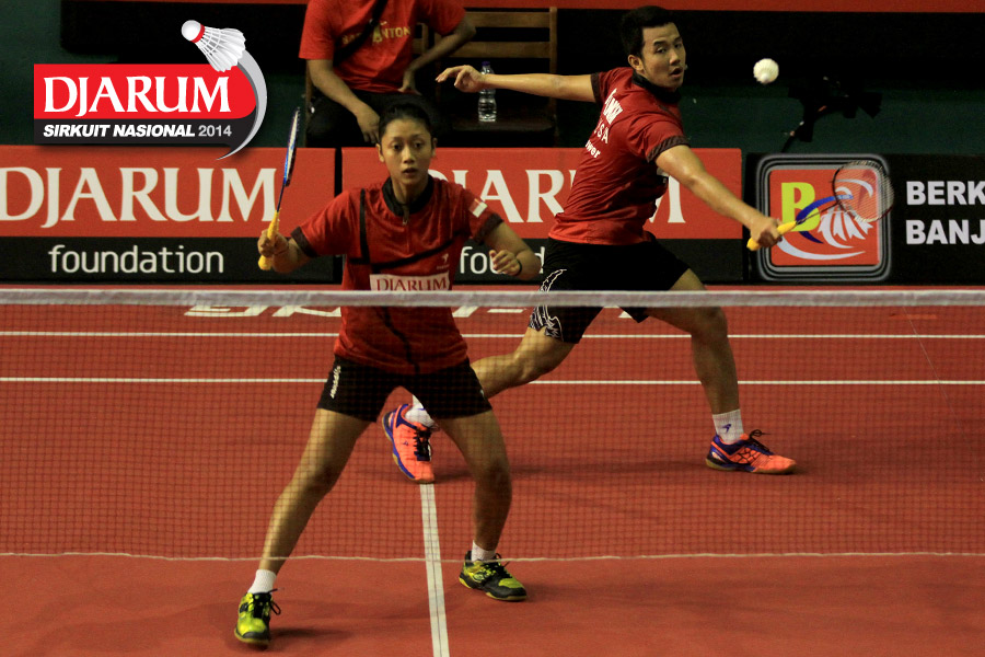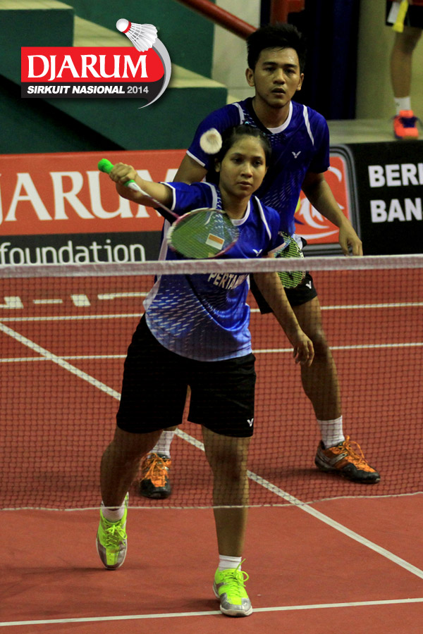 Indra Setiawan/Ganis Nurrahmandani (Pertamina Fastron) menyambut serve dari M. Maftuki/Cindy Ong (Pelatprov DKI Jakarta/Malibu)