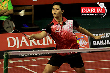 Sony Dwi Kuncoro (Tjakrindo Masters) bersiap mengembalikan shuttlecock ke arah Alvindo Saputra (Tangkas)