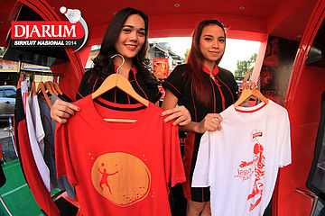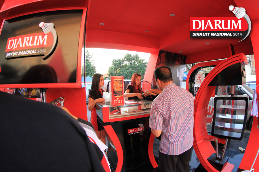 Dua usher saat memamerkan merchandise Djarum Sirkuit Nasional di booth Djarum Sirkuit Nasional Li-Ning Jawa Timur Open 2014