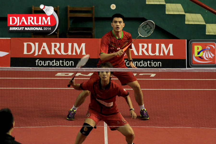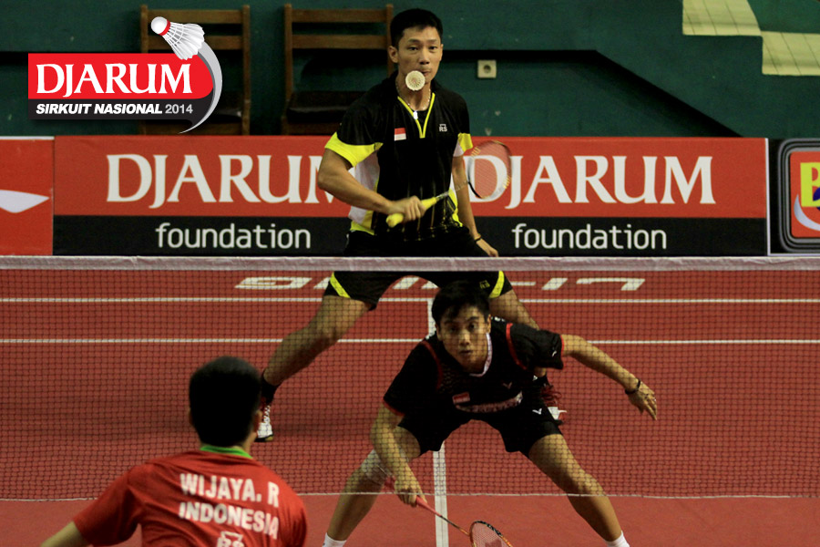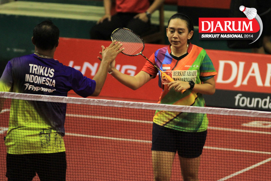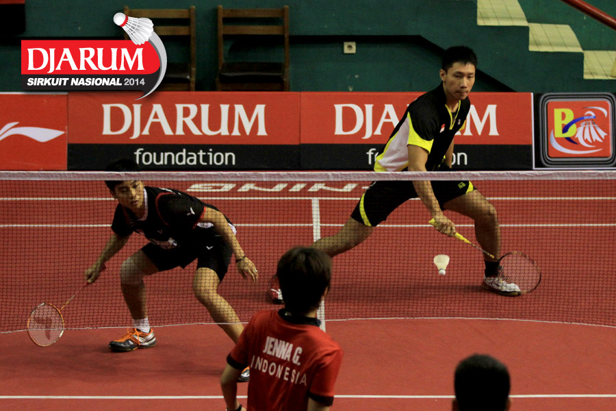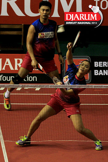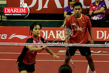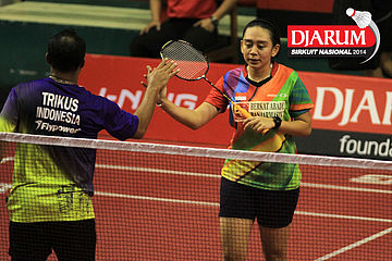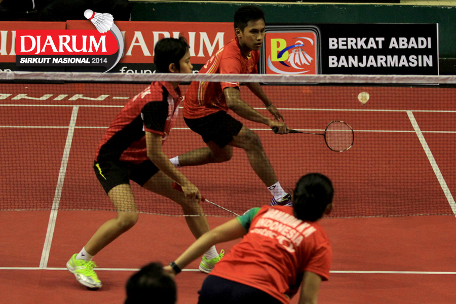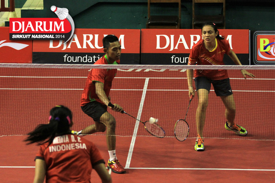 Ridho Akbar/Sri Wulan (Halim/Jaya Raya) mengembalikan shuttlecock ke arah Didit Juang/Deariska Putri (Djarum Kudus)