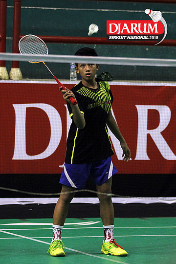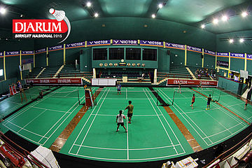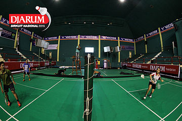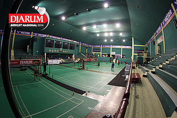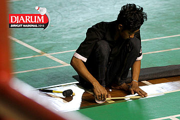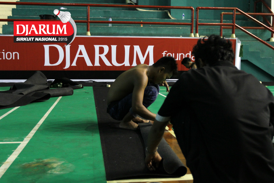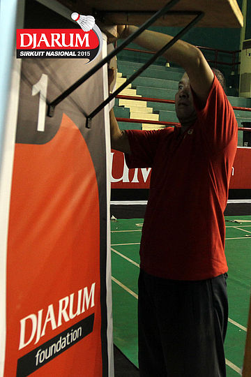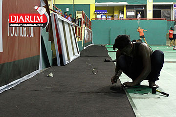 Salah satu pekerja saat memasang perlengkapan Djarum Sirkuit Nasional Li-Ning Jawa Timur Open 2015