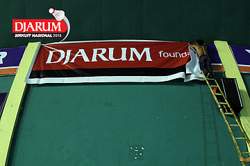 Salah satu pekerja memasang dekorasi Djarum Sirkuit Nasional Li-Ning Jawa Timur Open 2015