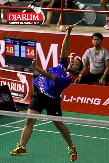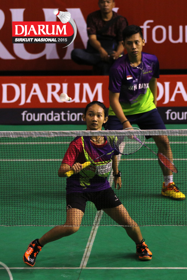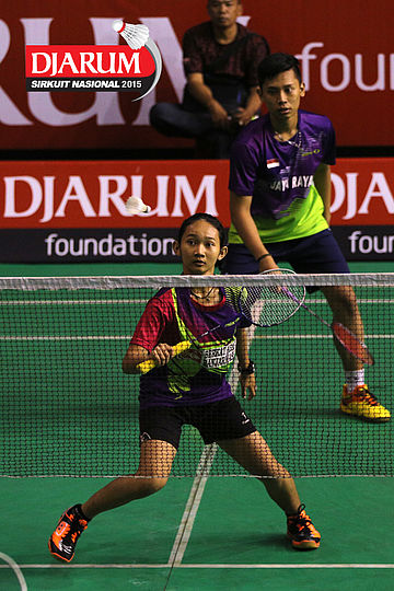 Yusril Argya/Peni Lanjarsari (Suryanaga Surabaya) mengembalikan shuttlecock