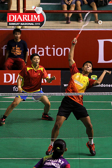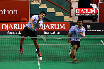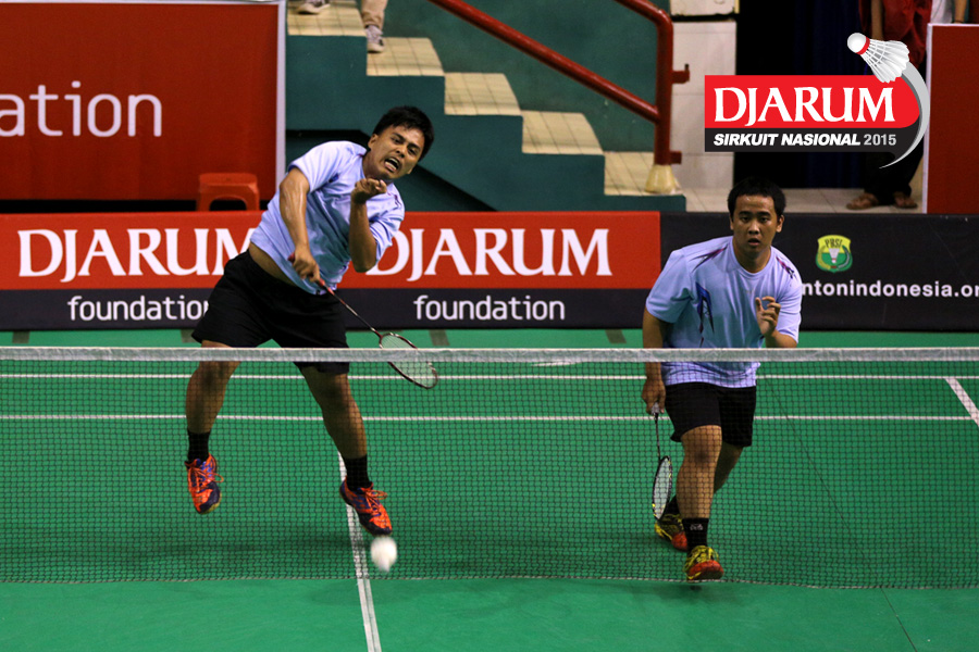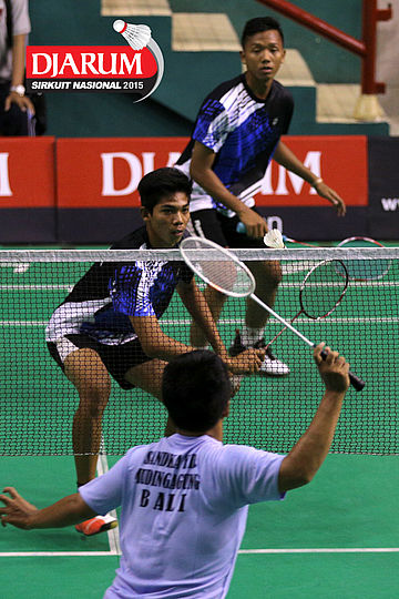 Gerald Siahaan/Yongky (Pelatprov Bali) mengembalikan shuttlecock