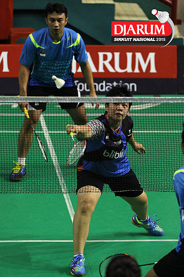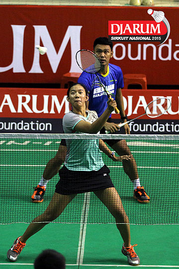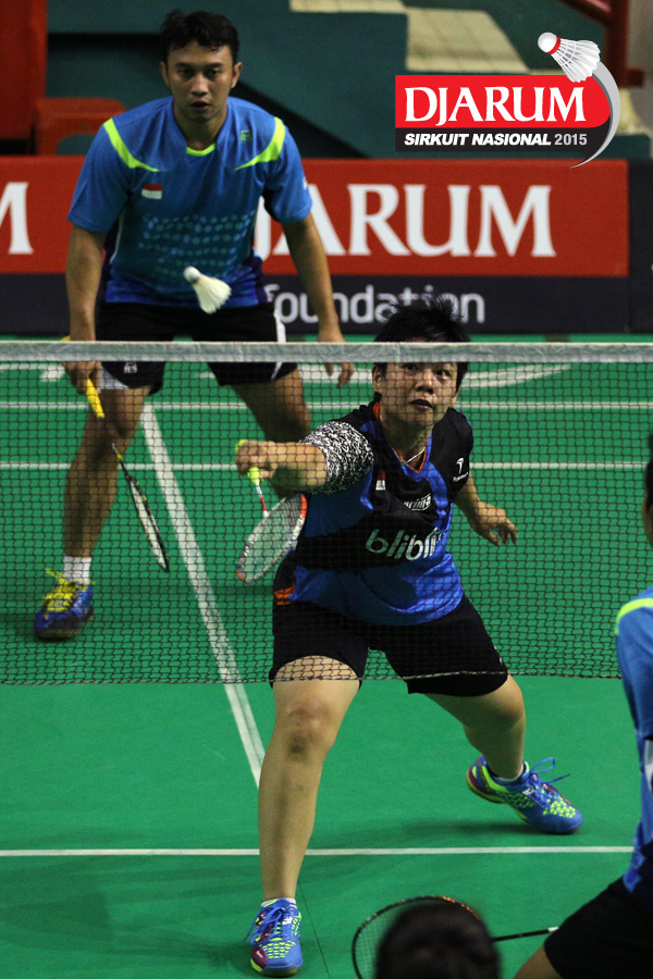 Trikusuma Wardhana/Meiliana Jauhari (Exist/Djarum Kudus) mengembalikan shuttlecock