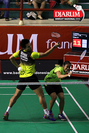 Afiat Yuris/Dian Fitriani (Pertamina Fastron) mengembalikan shuttlecock