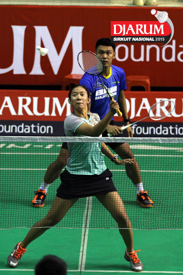 Ihsan Adam/Sri Wulan (Guna Dharma/Jaya Raya) bersiap menghadang serangan