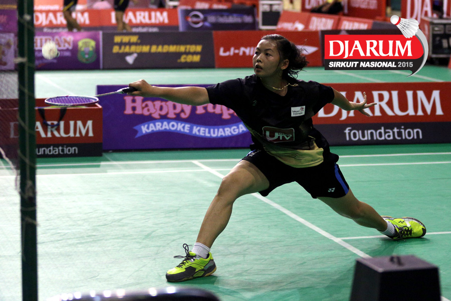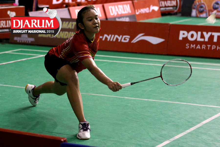 Tria Nur (Pusdiklat Telkom Jabar) mengembalikan shuttlecock