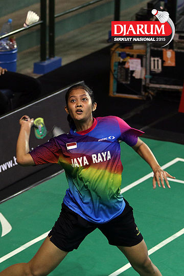 Erlina Kurniati (Jaya Raya) mengembalikan shuttlecock.