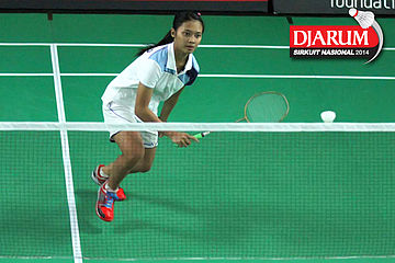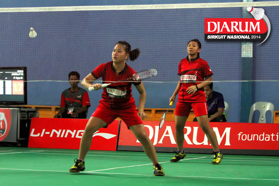 Karina Ria/Wulan Cahya (PB Djarum) mengembalikan shuttlecock ke arah Ni Made Pranita/Sarah Christin (Pelatprov Bali/Pelatprov DKI Jakarta).